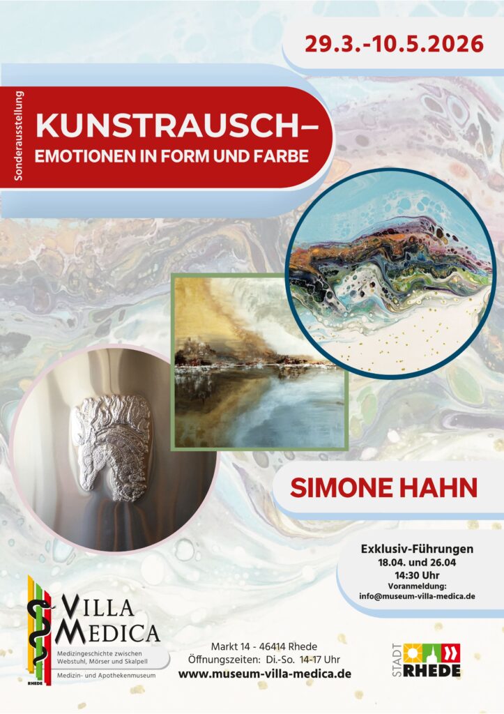 Eine Auswahl ihres Schaffens präsentiert Simone Hahn unter dem Titel “Kunstrausch” zwischen dem 29.03. und 10.05.2026 in unserer Sonderausstellung. Darüber hinaus bietet die Künstlerin am 18.04. und am 26.04 jeweils ab 14:30 einstündige Exklusiv-Führungen zu ihrem Werk. Der Eintritt in die Sonderausstellung ist im regulären Besucher-Preis des Museums mit inbegriffen. Für die Exklusiv-Führungen bitten wir um eine Voranmeldung an die info@museum-villa-medica.de.